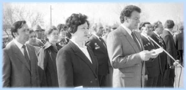 Узнаёте? На снимке, сделанном, скорее всего, Светланой Николаевной Горковенко 9 мая 1987 года некогда первая тройка руководителей района: начальник управления сельского хозяйства Александр Сергеевич Максимов, первый секретарь райкома партии Культай Ашимовна Демисенова, председатель райисполкома Валерий Иванович Поддубный.